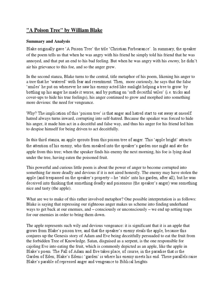 He was also an excellent painter and. The word tree in Poison Tree may be used as a generic term for any plant that produces toxic chemicals to protect itself from predators. It bore a fruit which the enemy saw with eager eyes.